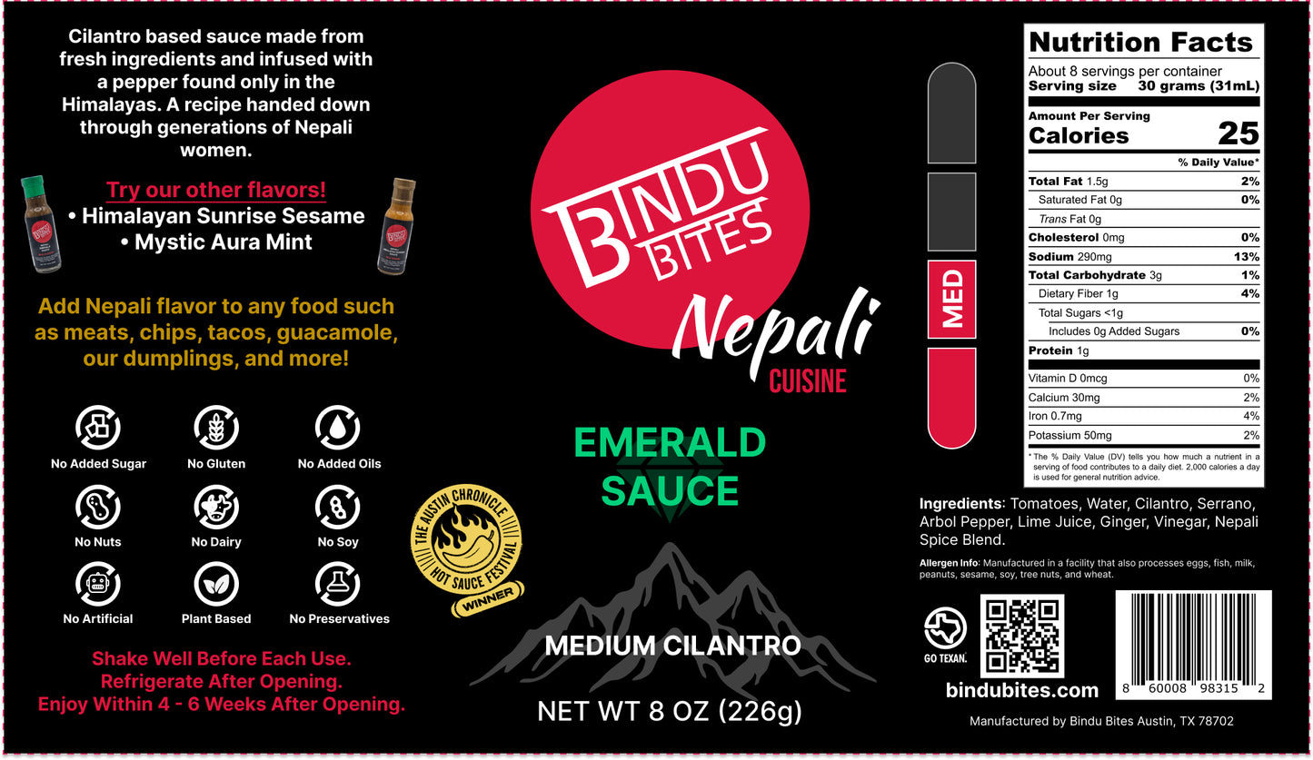 Cilantro based Nepali sauce made from fresh ingredients and infused with a pepper only found in the Himalayas. A recipe handed down through generations of Nepali women. Use Bindu Bites sauces to add a punch of flavor to any food such as baked potatoes, chips, naan, meats, pastas, and of course momos (Nepali Dumplings).
